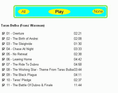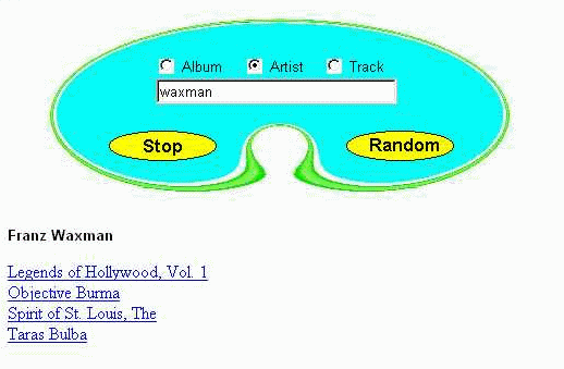 Selecting an album will display additional controls. Clicking "ALL" will cause all the displayed tracks to be marked for playing, "NONE" will deselect all tracks. Clicking "PLAY" will cause mpg321 to be invoked with the checked tracks as it's arguments.